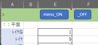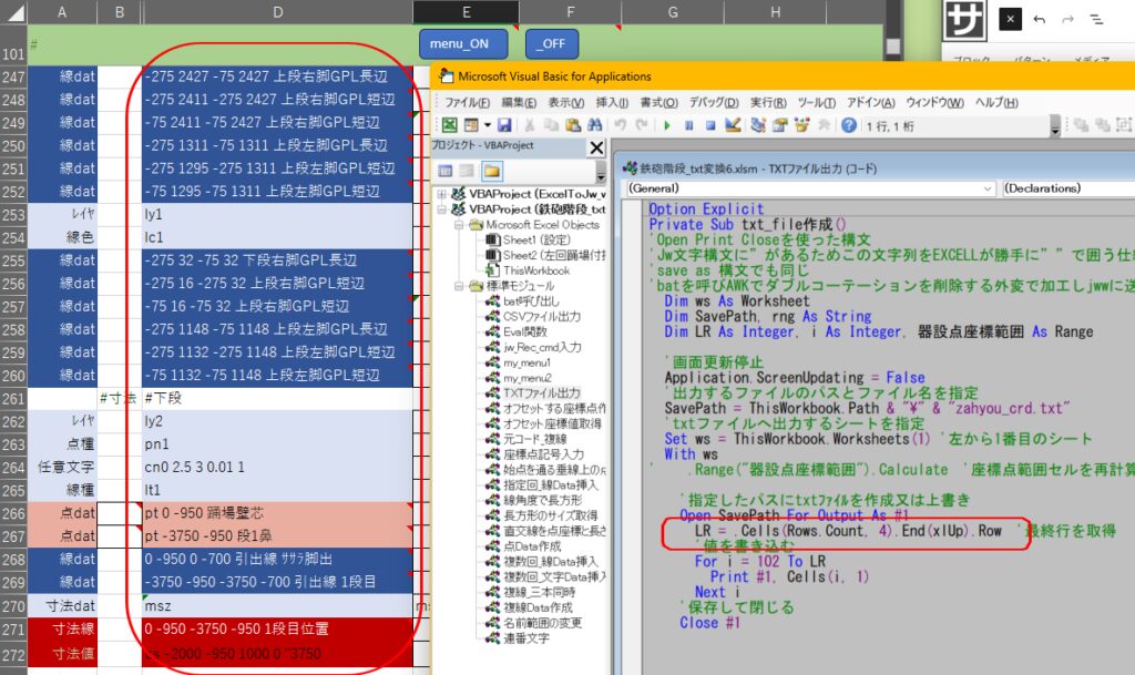 エクセルシートのD列の内容がtxtファイルに書き込まれます。D列セルには各セルで計算した値をjwwで読み込めるように計算式が入っています。通常時は非表示で使います。改良して使う場合はマクロ(txt_file作成)の列記述も修正してください。