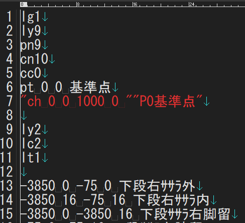 txtファイルへの変換保存するマクロはホップアップメニューの最下端に配置した。マクロを実行すると文字形式は”ch 0 0 1000 0 ””p0基準点”の様に不要な「”」が付く。これを次工程のgawkで消去する。