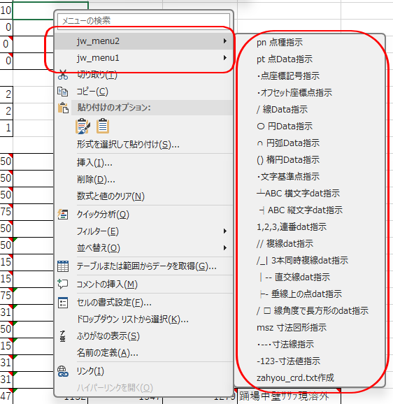 jwwで読み込むためのデータ形式を予めテンプレート行に作っておき必要に応じて必要な行にコピペして使うためのマクロを作った。データ形式は線・点・文字等多くあるのでサブメニューを右クリックでホップアップさせて必要な形式を選択できるようにメニューにマクロボタンを配置した。