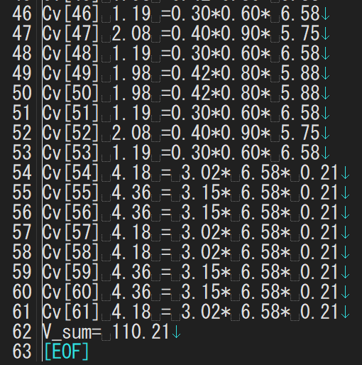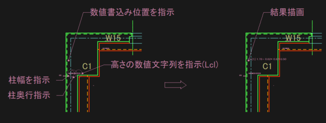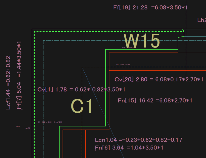 部位データは、柱では部材左下に柱幅・柱奥行・階高が表示されています。(例:C1 0.62 x 0.82 flr_hgt=3.50) これをbatファイルの誘導で幅・奥行・階高とマウスクリックします。数値文字をクリックするとjwwの選択色に変化します。積数は必要な数値を入力します。結果表示は記号+計算値と計算式が並んで描画されます。例:Cv[1] 1.78 =0.62*0.82*3.50*1
